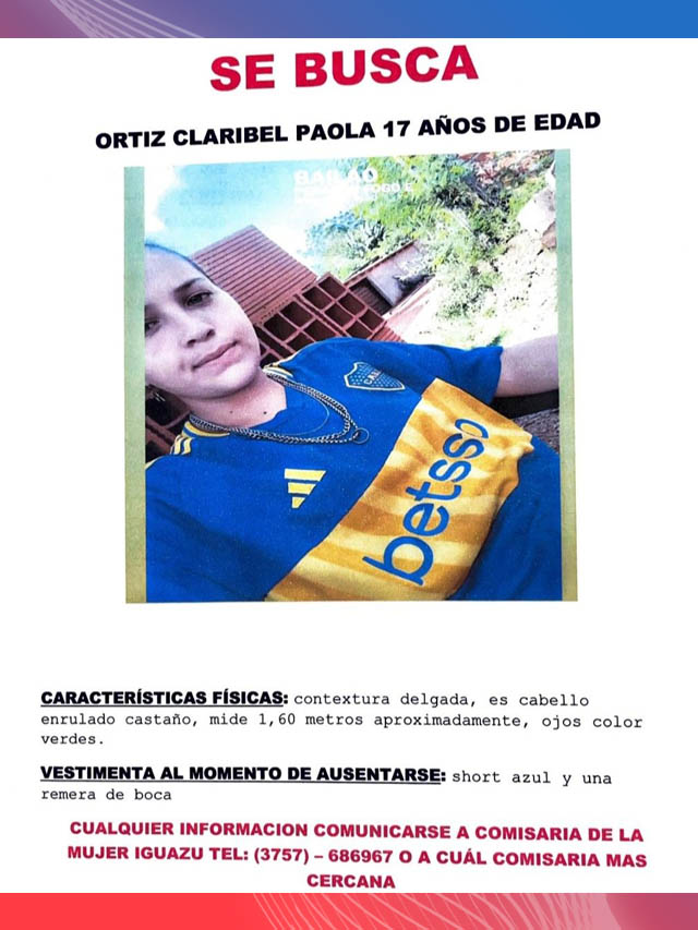 La Policía de Misiones, a través de la Comisaría de la Mujer de Puerto Iguazú, inició la búsqueda de una adolescente de 17 años identificada como Ortiz Claribel Paola, quien fue reportada como desaparecida en las últimas horas.