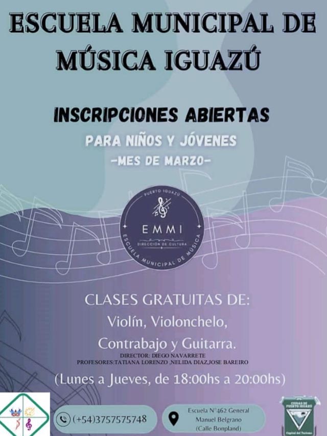 AGENCIA MISIONES.UNO | La Escuela Municipal de Música de Puerto Iguazú abrió sus inscripciones para niños y jóvenes interesados en aprender a tocar instrumentos y formarse en el ámbito musical a través de clases gratuitas.