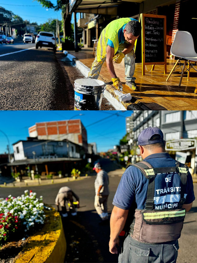 AGENCIA MISIONES.UNO | El equipo municipal del Taller de Tránsito realiza trabajos de pintura y demarcación sobre la avenida Perito Moreno hasta la rotonda, mientras la Policía de Tránsito Municipal regula la circulación para garantizar la seguridad de trabajadores, conductores y peatones.