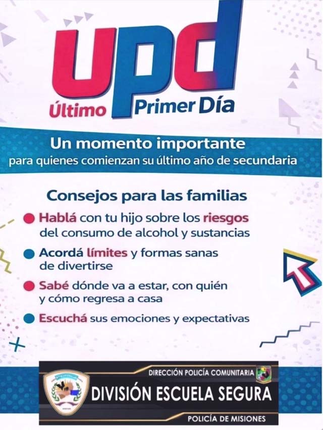 AGENCIA MISIONES.UNO | En el marco del denominado “Último Primer Día” (UPD), la Dirección Policía Comunitaria, a través de la División Escuela Segura, difundió una serie de recomendaciones destinadas a las familias de estudiantes que comienzan su último año de secundaria.