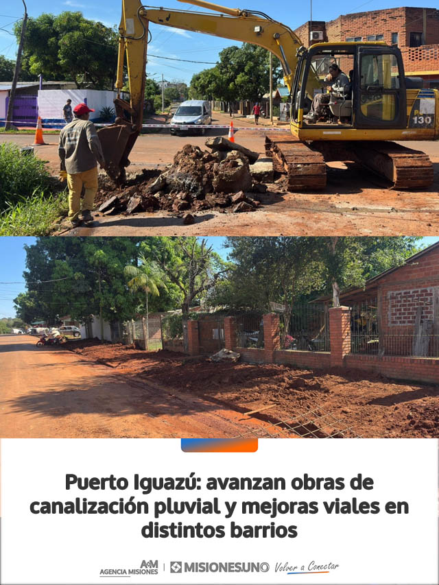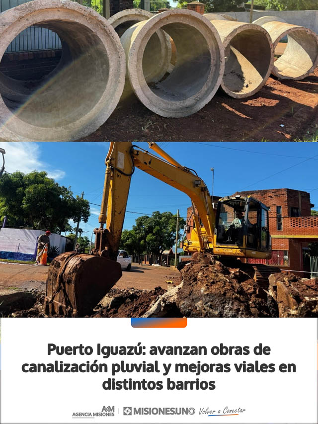AGENCIA MISIONES.UNO | La Municipalidad de Puerto Iguazú avanza con trabajos de infraestructura urbana en distintos sectores de la ciudad, que incluyen la instalación de canalización pluvial y la preparación de calles para futuras obras viales.**