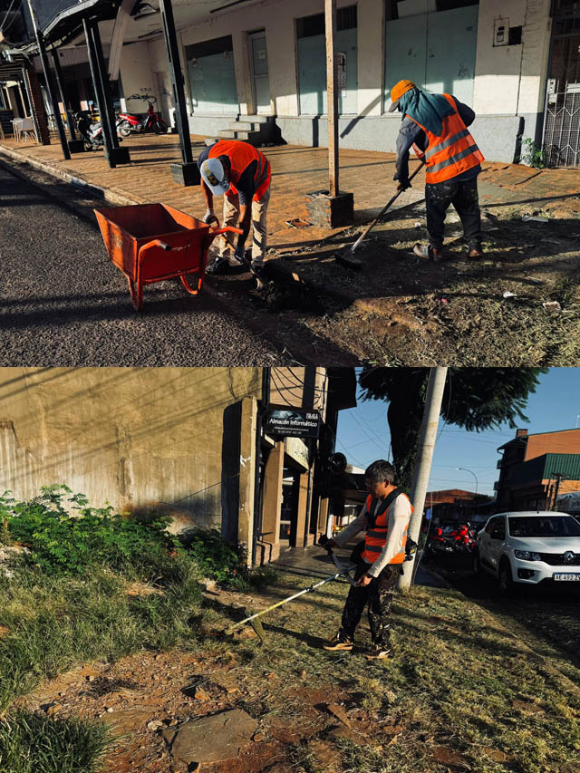 AGENCIA MISIONES.UNO | El equipo de Mantenimiento, dependiente de la Dirección de Tránsito de la Municipalidad de Puerto Iguazú, avanza con trabajos de limpieza de veredas y cordones cuneta en distintos puntos de la ciudad, como paso previo al pintado y remarcado de señales de estacionamiento.