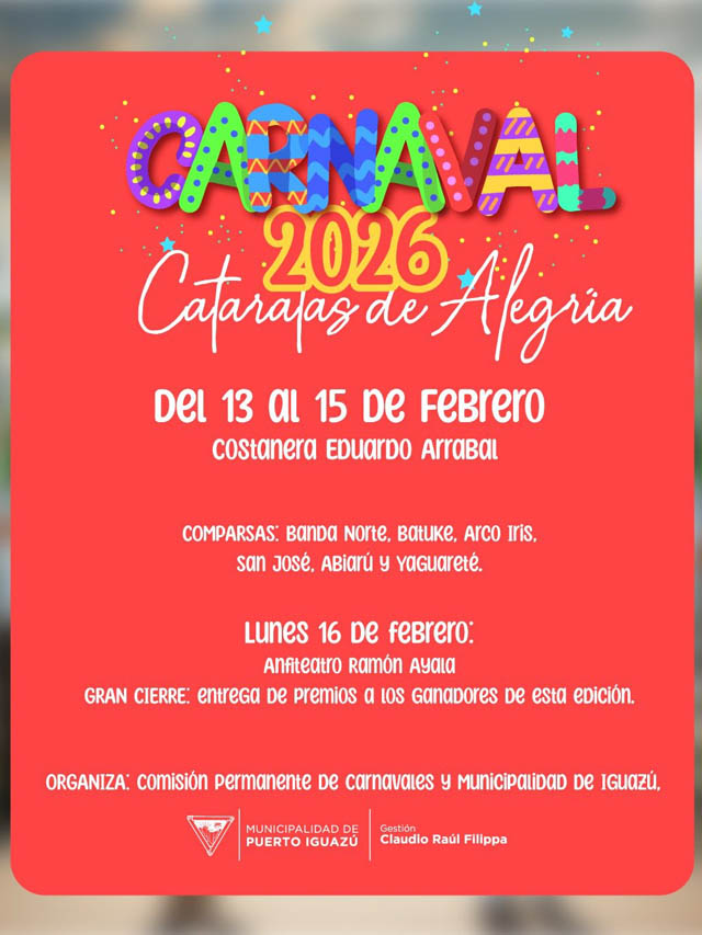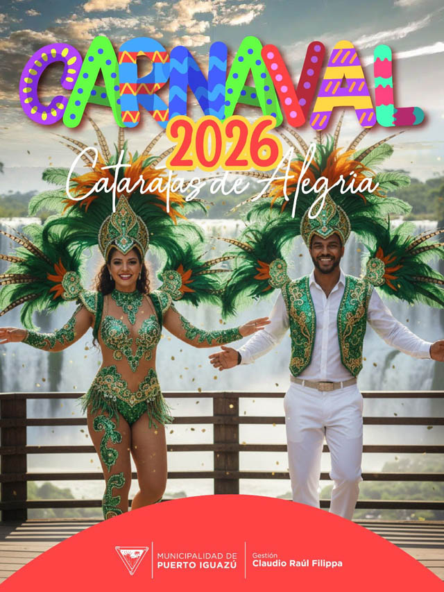 AGENCIA MISIONES.UNO | La ciudad de Puerto Iguazú celebrará el Carnaval 2026 los días 13, 14 y 15 de febrero en la costanera Eduardo Arrabal, con shows en vivo, comparsas y una gran fiesta popular.