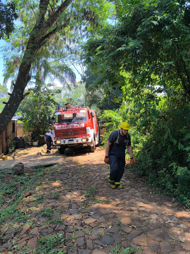 AGENCIA MISIONES.UNO | Tres dotaciones de los Bomberos Voluntarios de Puerto Iguazú intervienen en un incendio forestal registrado en el barrio Ribera del Paraná, donde existe peligro de propagación hacia viviendas cercanas.