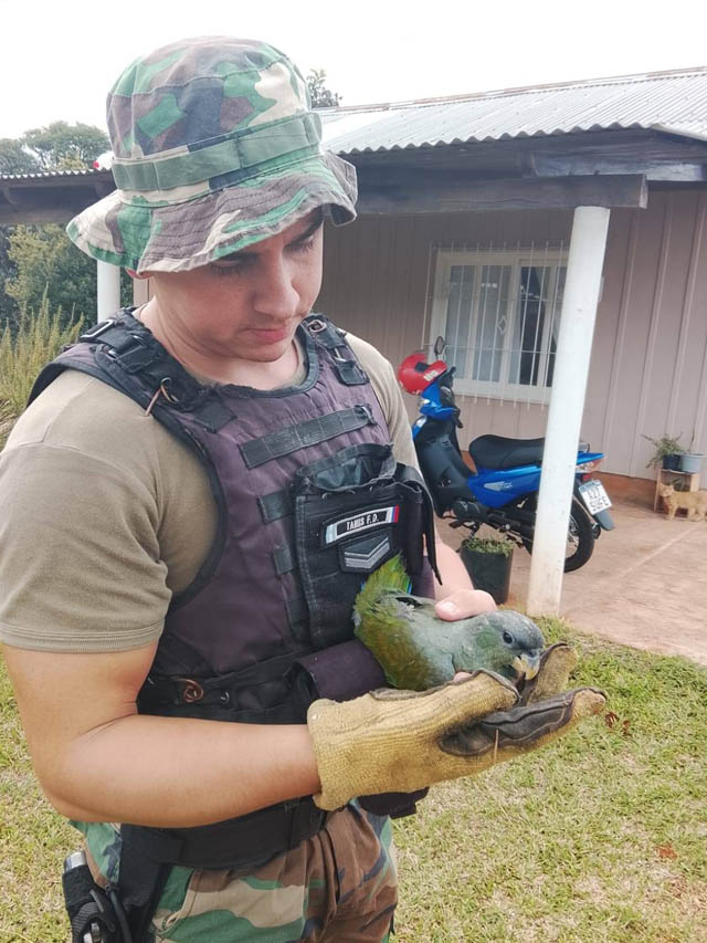 Más tarde, alrededor de las 17:55, personal de la División Defensa del Medio Ambiente y Delitos Rurales de San Vicente intervino en un segundo procedimiento sobre la Ruta Nacional 14, a la altura del kilómetro 972, donde rescataron un ejemplar de loro maitaca (Pionus maximiliani).